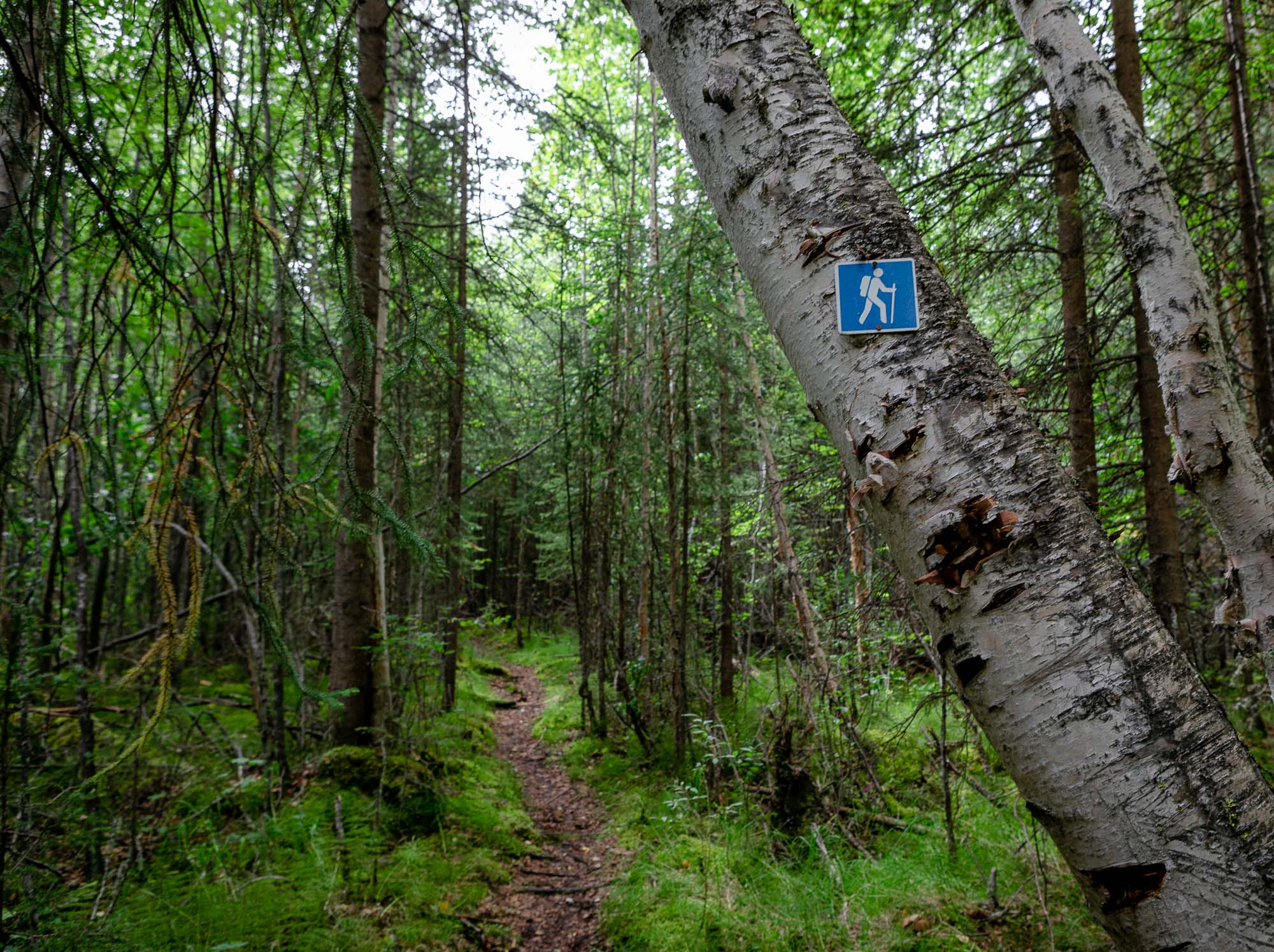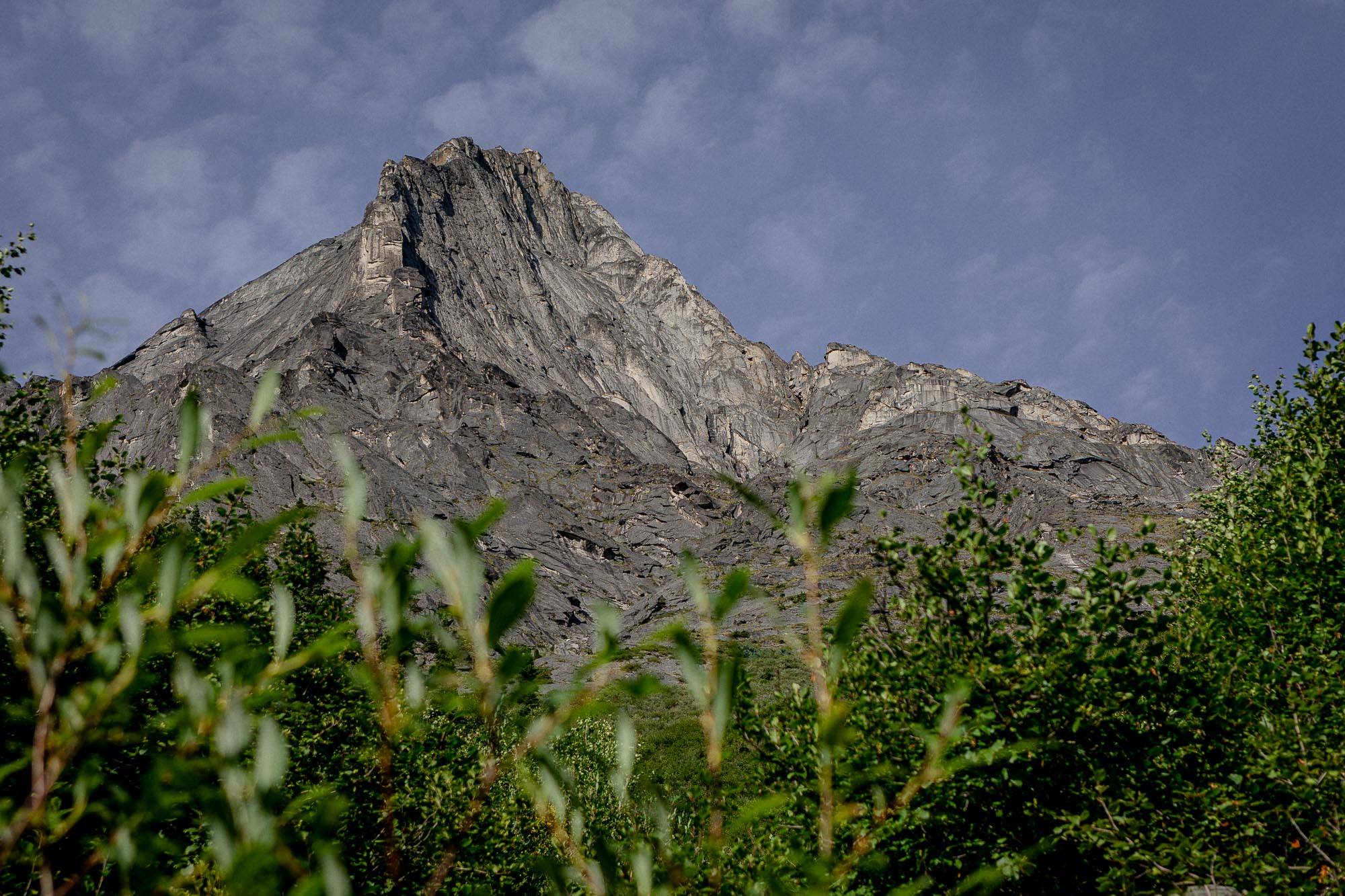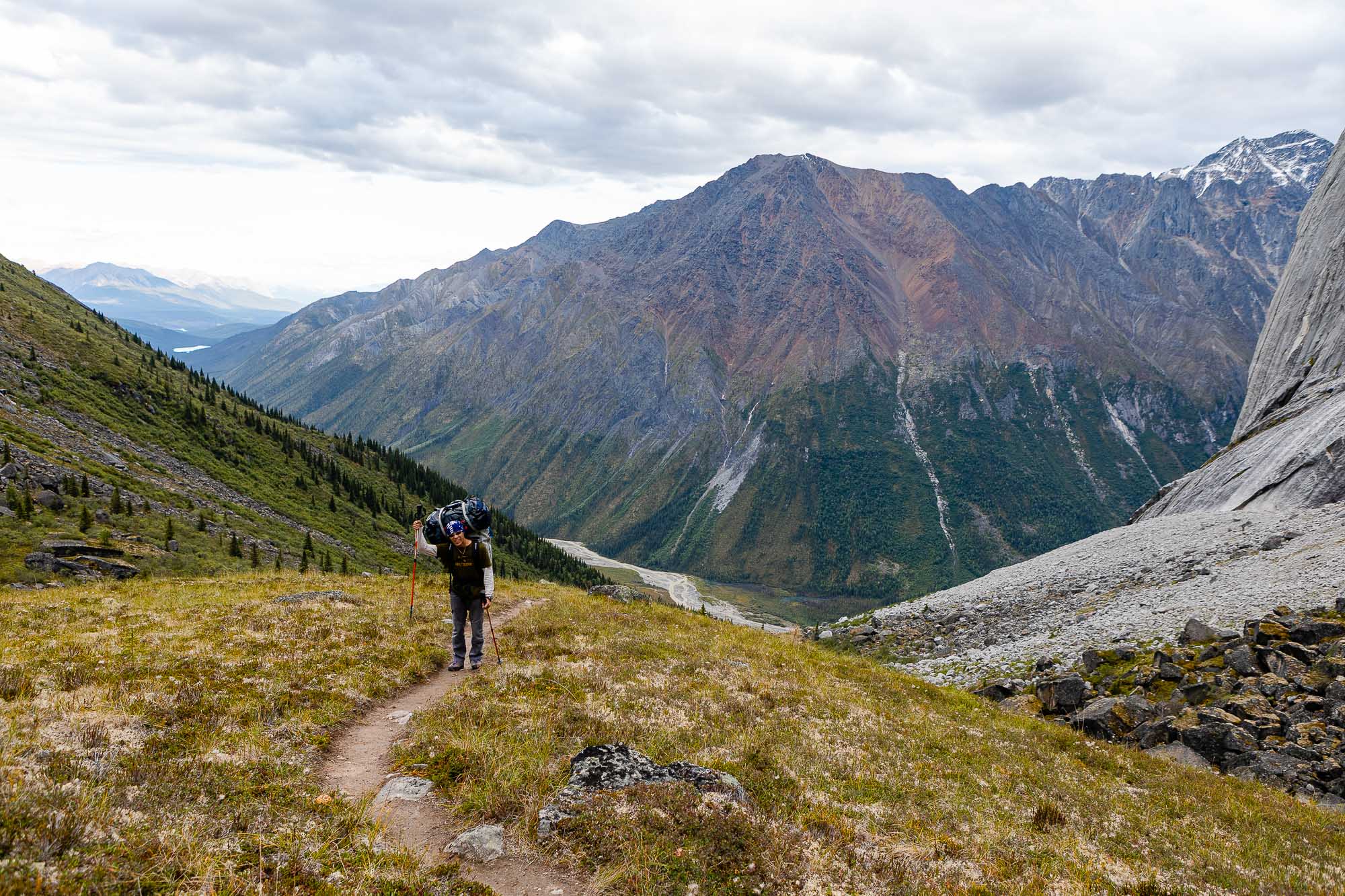 After doing so many switchbacks in the steep forest trail, we were greeted with a great view of Mount Harrison Smith. It was 16:38 at this point and we walked 3 hours so far. We were at the end of the forest at this point, and then the trail went through bushes and talus.