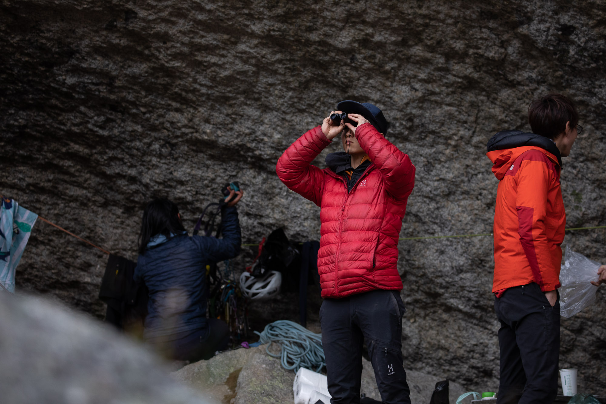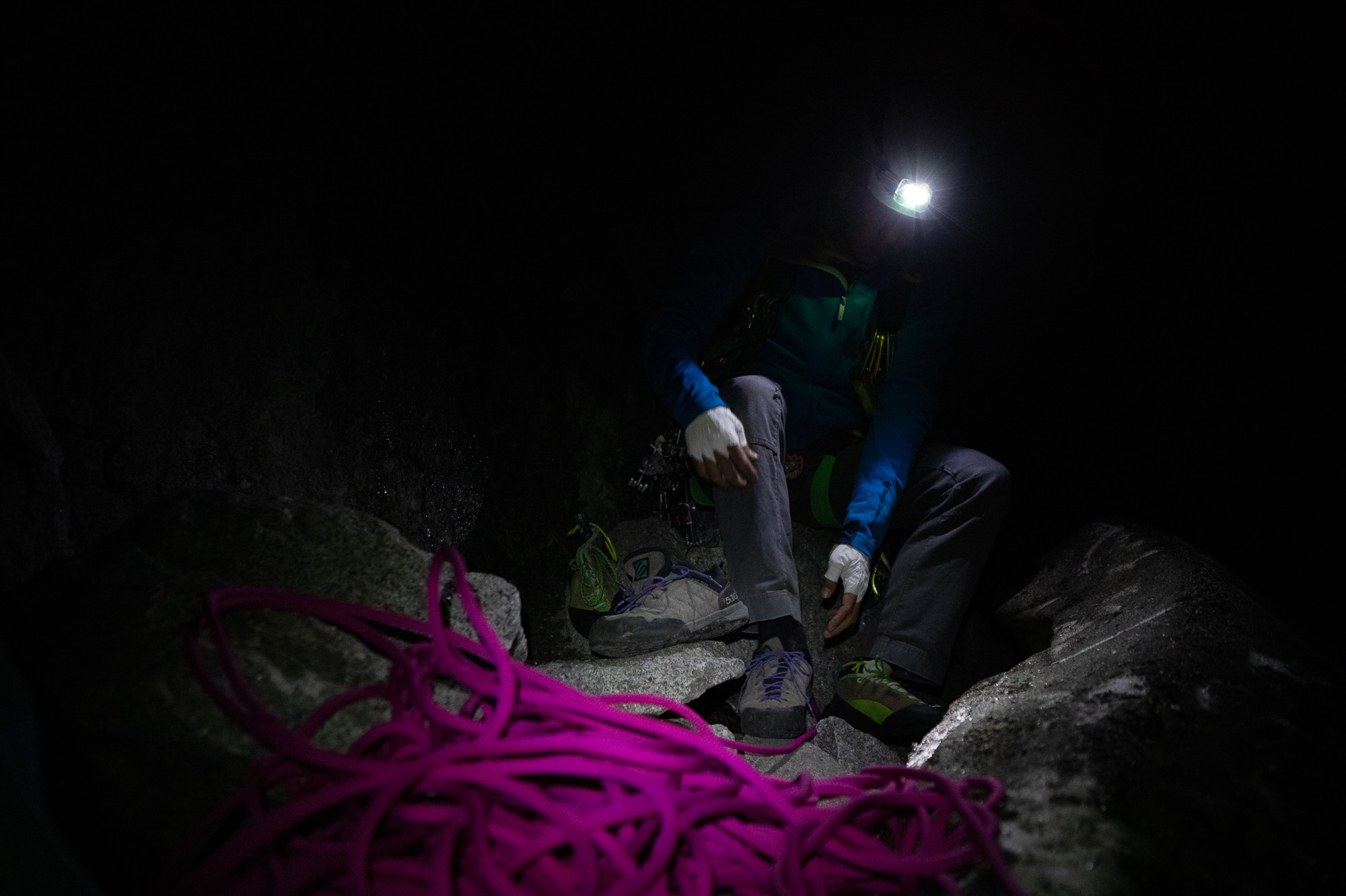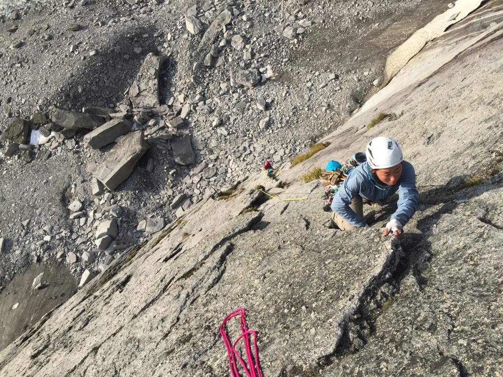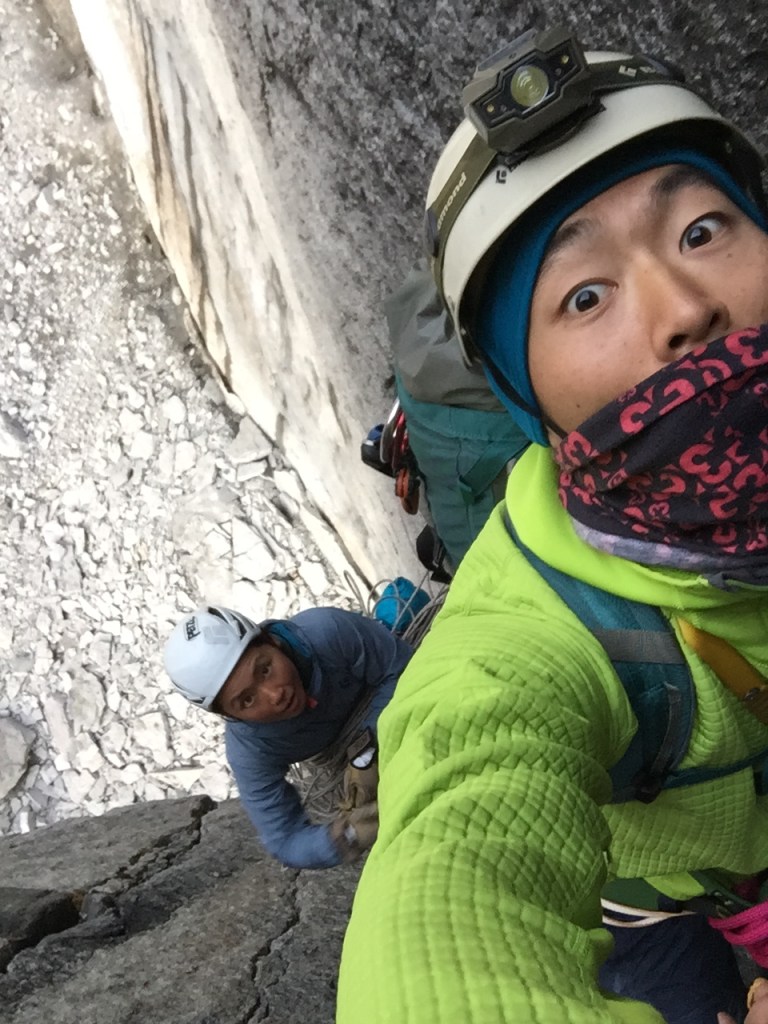 The approach was more difficult in dark, especially the second half of rocky sections where trail was hard to find. It took us about 1 hour and 50 minutes to get to start of the climb. Botch and I started climbing first because I had a camera and wanted to take photos of other party below us. I had never climbed with any camera gears before, and I immediately knew that it was a mistake… Climbing with my camera in my backpack was way harder than I imaged… I had to climb really slow, but I still had to use so much power. In addition, the first 2-3 pitches were wet, and I never climbed in wet condition neither… It seemed like that everything was trying to slow me down…