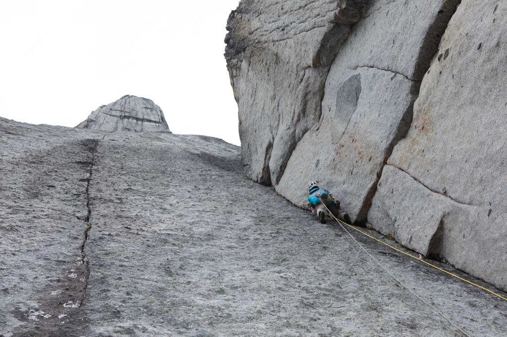 The day broke and we did not need headlamps anymore while we were still at the first few pitches. I felt so damned. I wished that I could climb better and faster. It was already past 8:00am when we finally entered the long chimney section. Then, we came to the big ledge at 13:30. This was where people bivy if they did it by two days. We planned to climb it in one go, however, we did not have any camping gears or extra food/water.