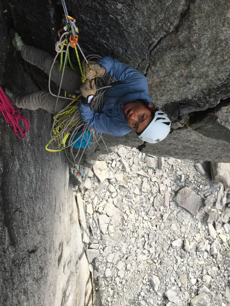 We watched Yuki and Asako climbing the first pitch from the ledge, and then started rappelling down. It started raining soon after we started going down. We were not so sure of rappelling route and went back into the chimney. It was a wrong decision… All the rappel stations were climber’s right of the chimney, and it did not go back into the chimney. When we went to the chimney, our rope got stuck and had really a hard time going down. At the end, Yuki and Asako came down and helped us. They also bailed due to time and poor weather.