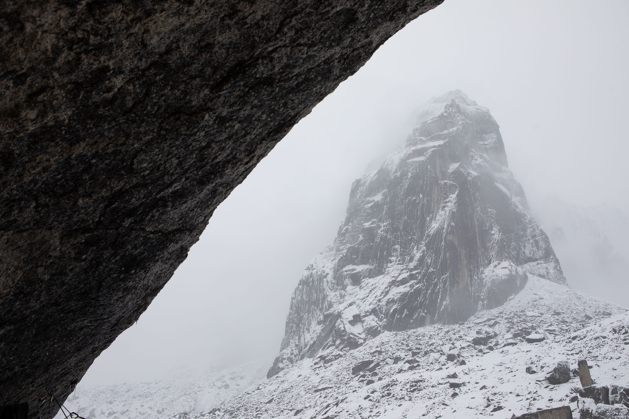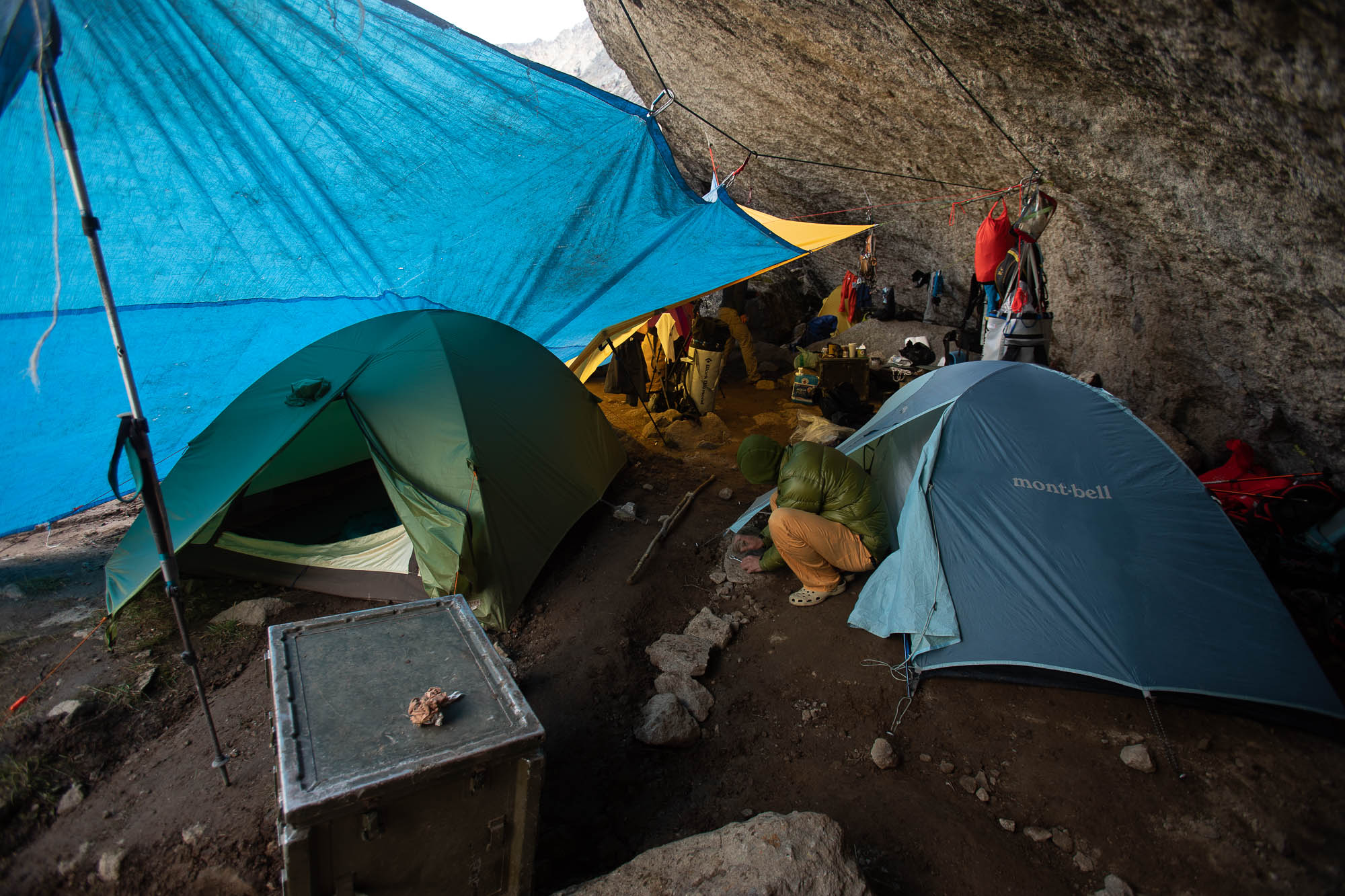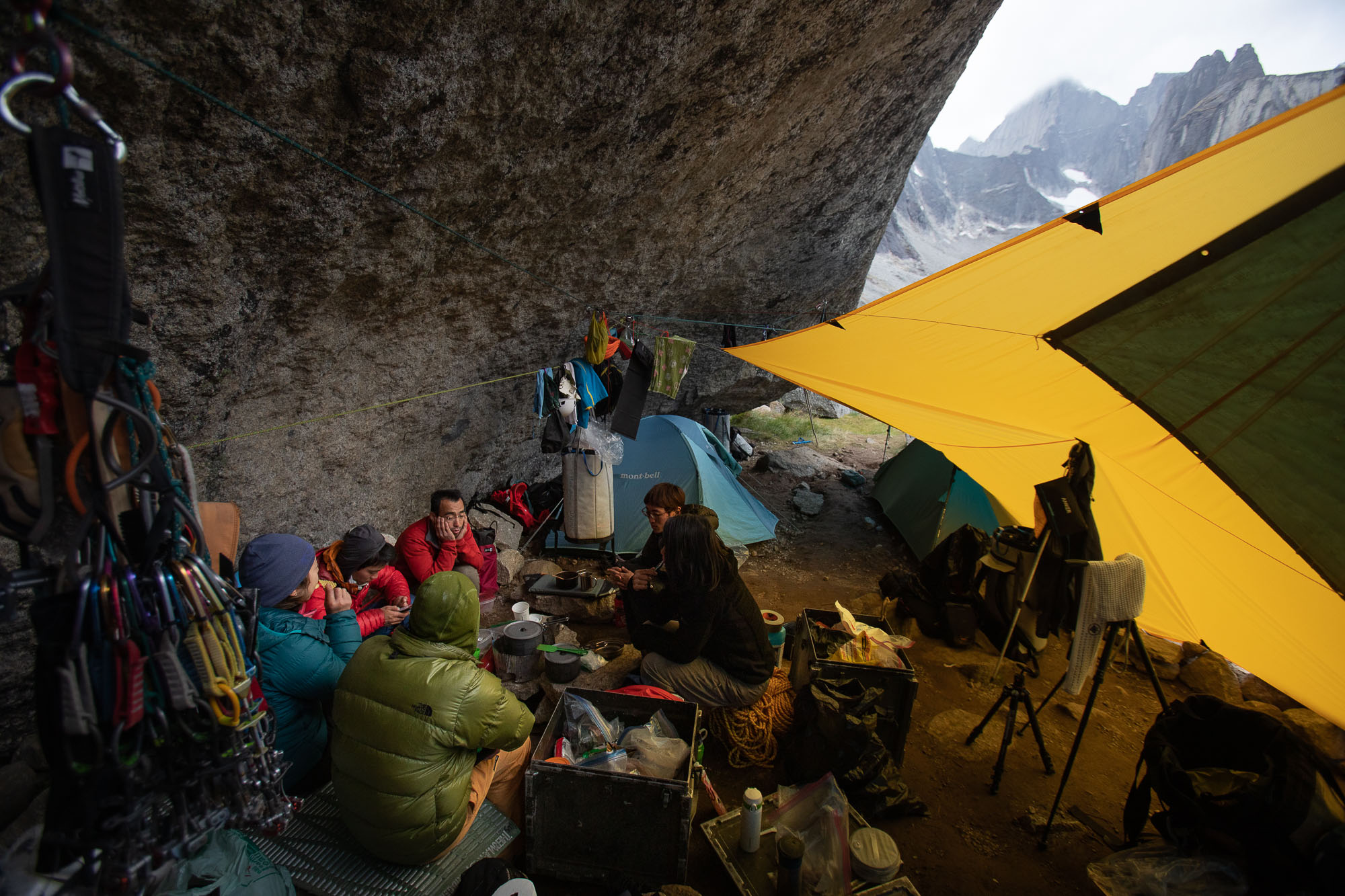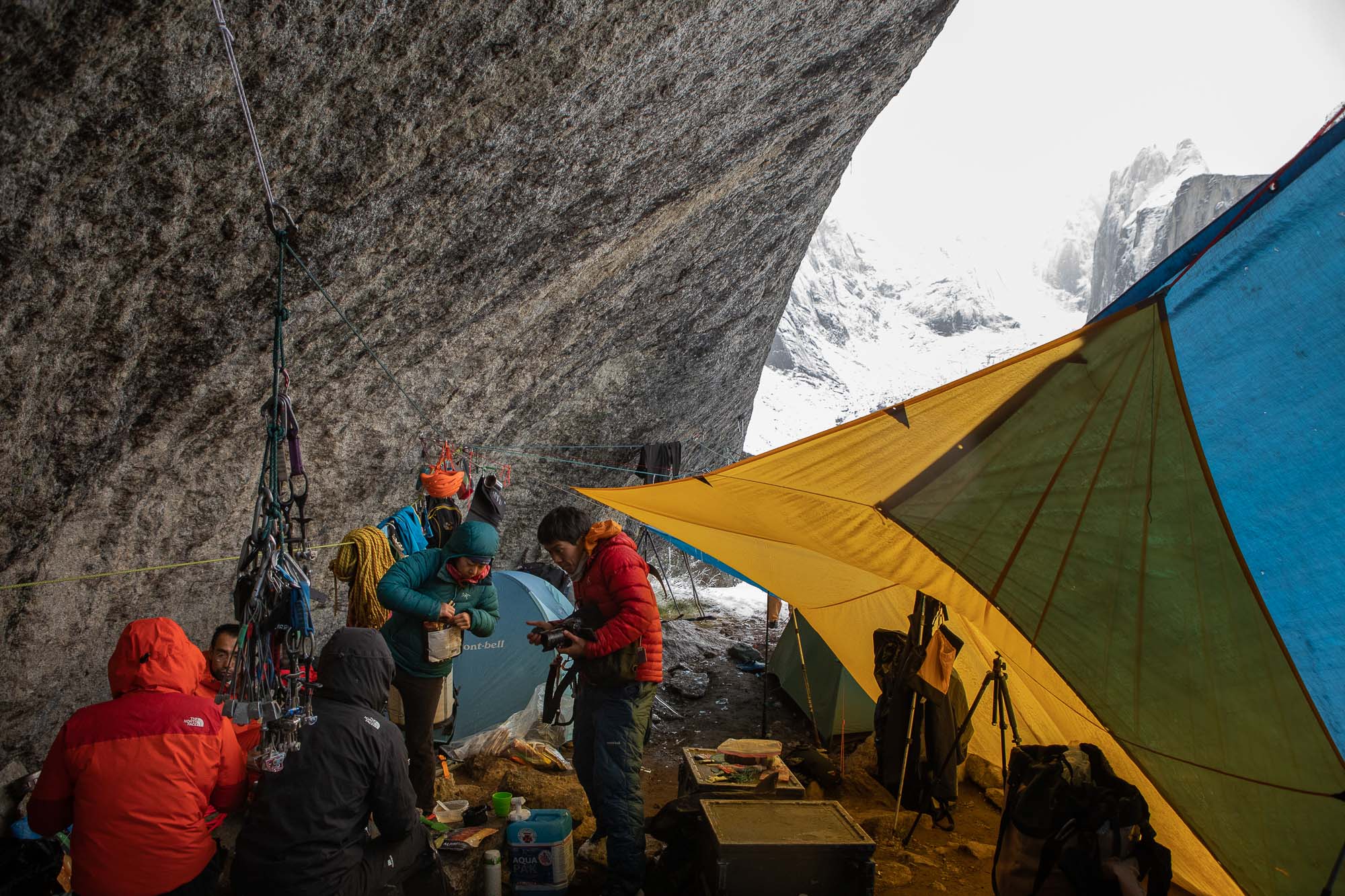 As our plan for this entire trip was to put a new free climbing route, we practiced hand drilling and added a couple of bolts to our base camp rain shelter system. It took a person for more than one hour to drill a whole and put a bolt in it. Of course, we would do it better eventually, but it was how long it could take for beginners. The weather became clear by the noon, so Yuki and Marubou packed route developing gears and went for it. Rest of the crew stayed at the camp and made our camp more comfortable. I followed Yuki and Marubou to take some photos from the ground.