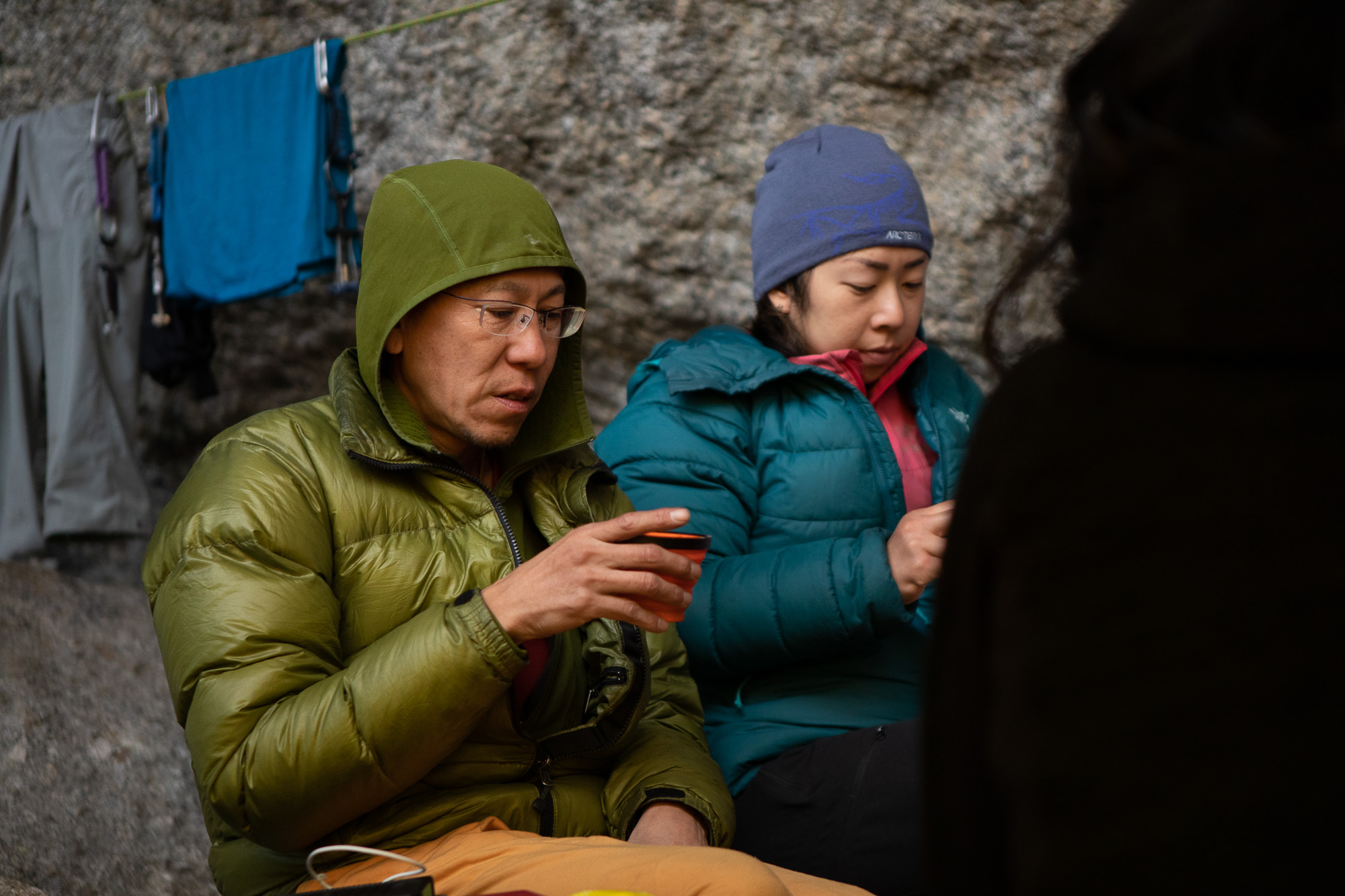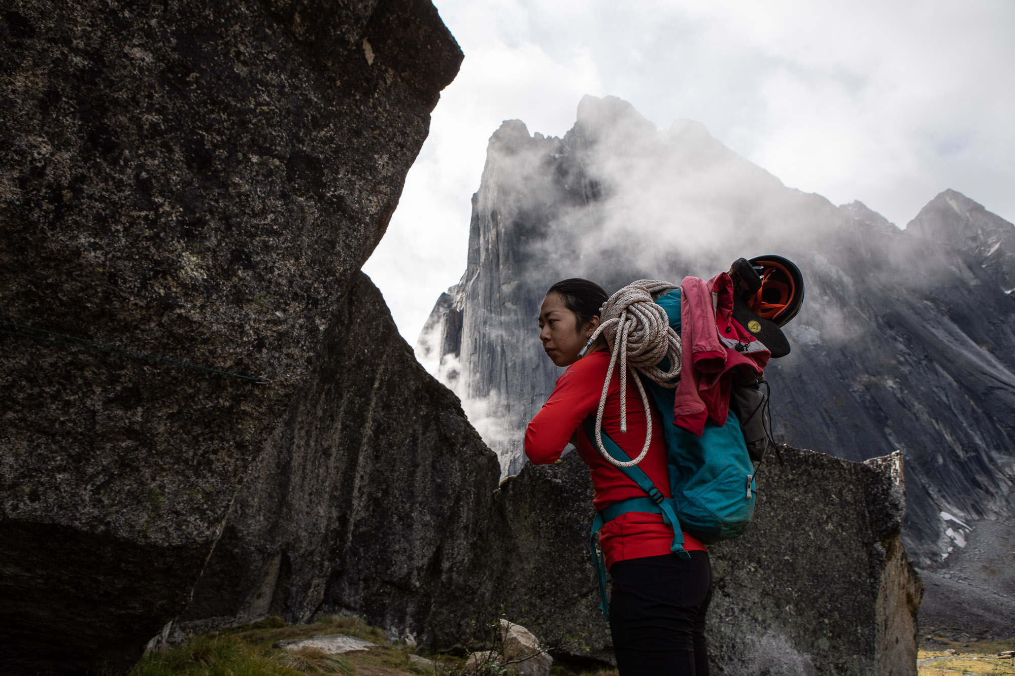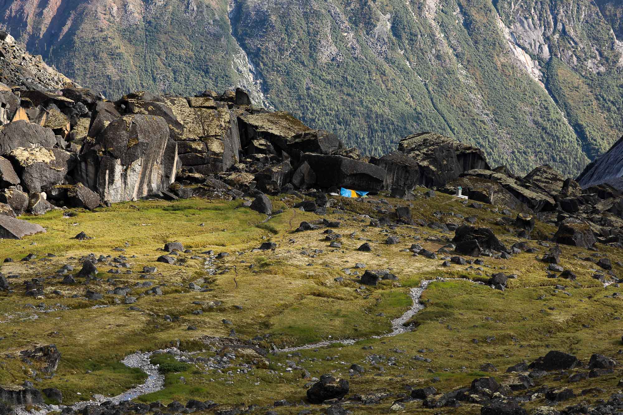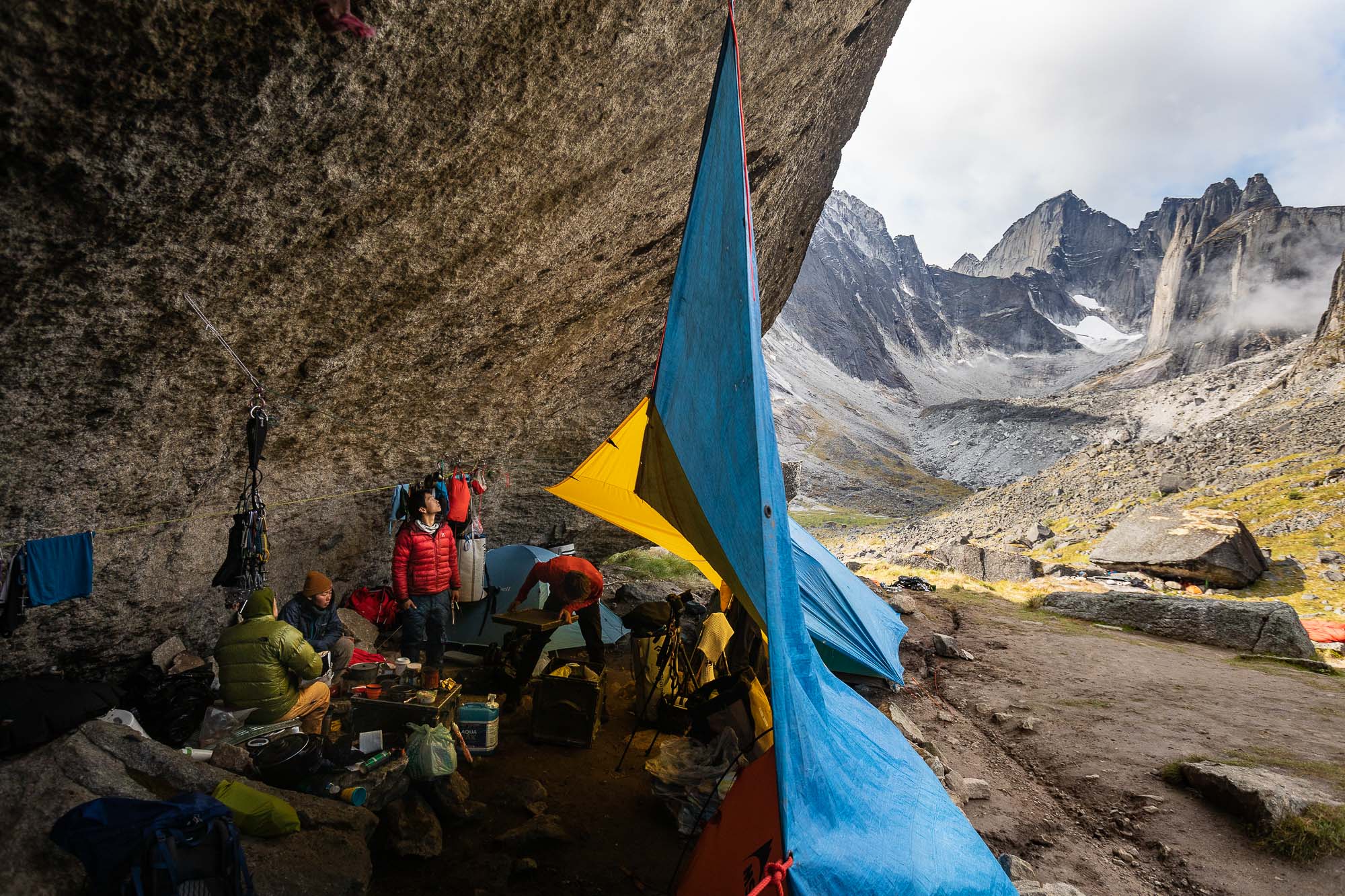 As our plan for this entire trip was to put a new free climbing route, we practiced hand drilling and added a couple of bolts to our base camp rain shelter system. It took a person for more than one hour to drill a whole and put a bolt in it. Of course, we would do it better eventually, but it was how long it could take for beginners. The weather became clear by the noon, so Yuki and Marubou packed route developing gears and went for it. Rest of the crew stayed at the camp and made our camp more comfortable. I followed Yuki and Marubou to take some photos from the ground.