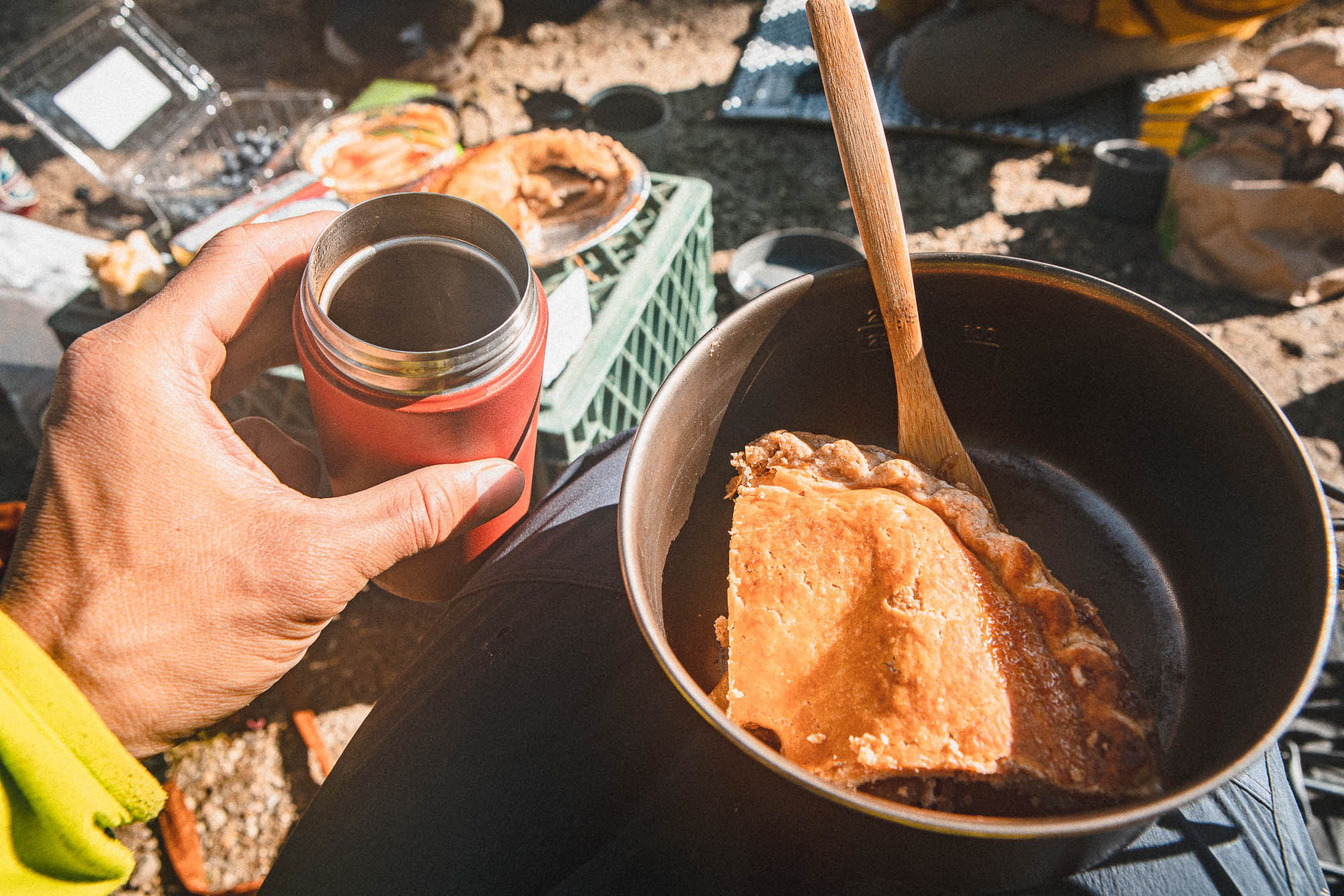 Next morning, We celebrated the big day with coffees and apple pies while we spread our gears all over the place and dried them.