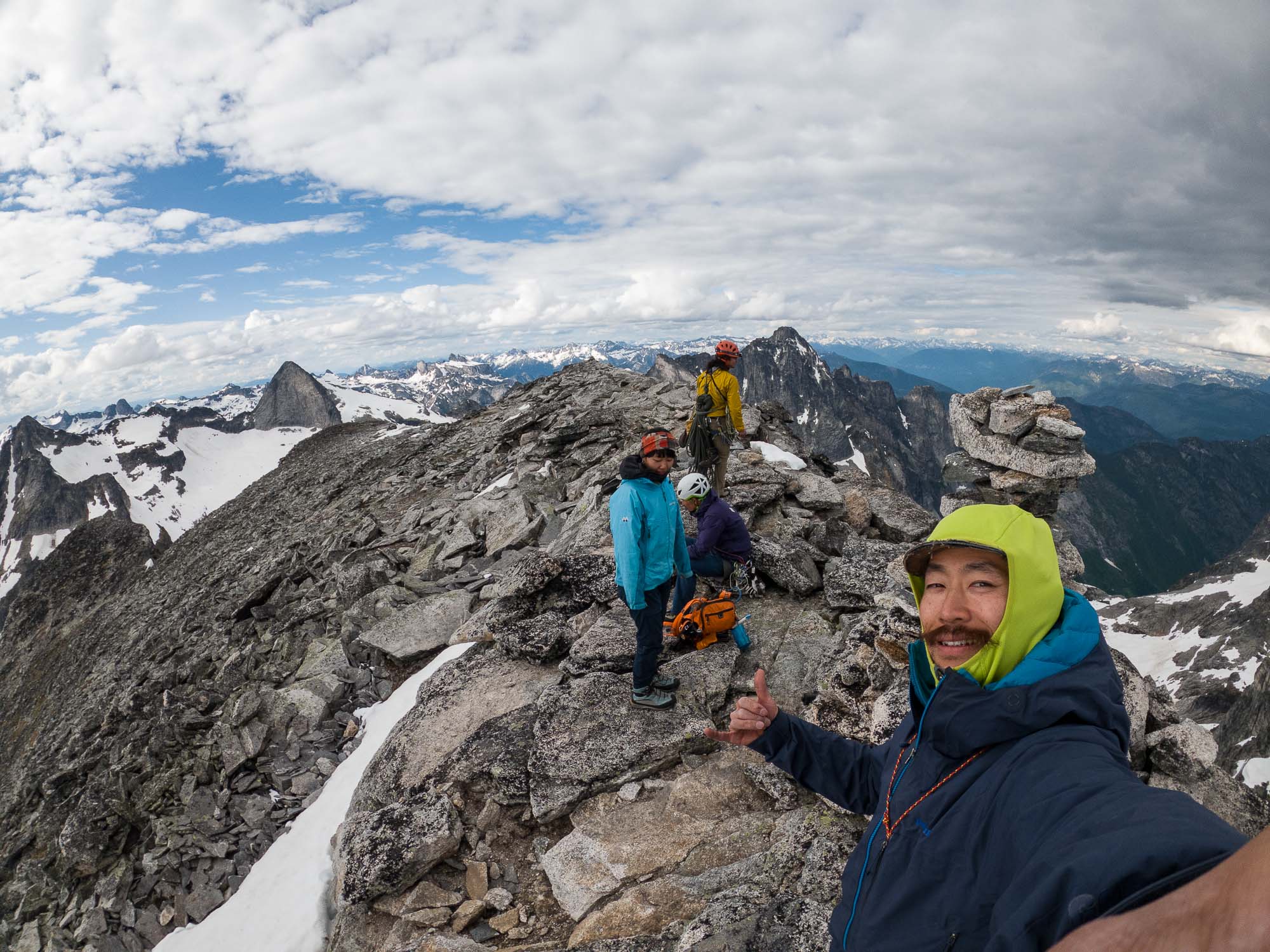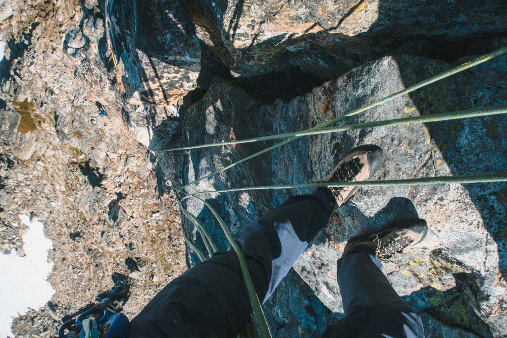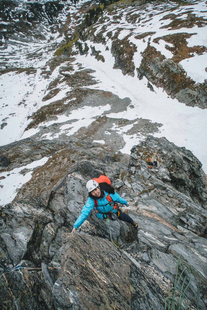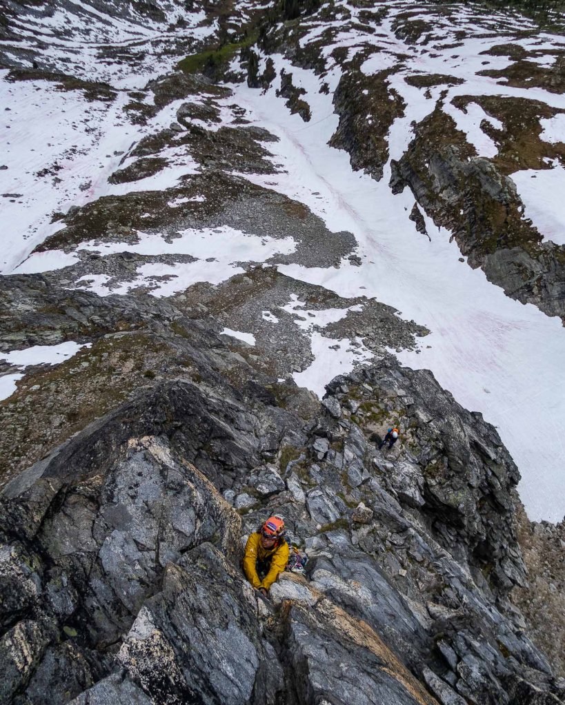 This route is graded as 5.10a, but majority of this route is around 5.6 to 5.9. It has a few big ledges, which your team can lay down and take a nap. It is surely one of the best enjoyable alpine climbings in BC!