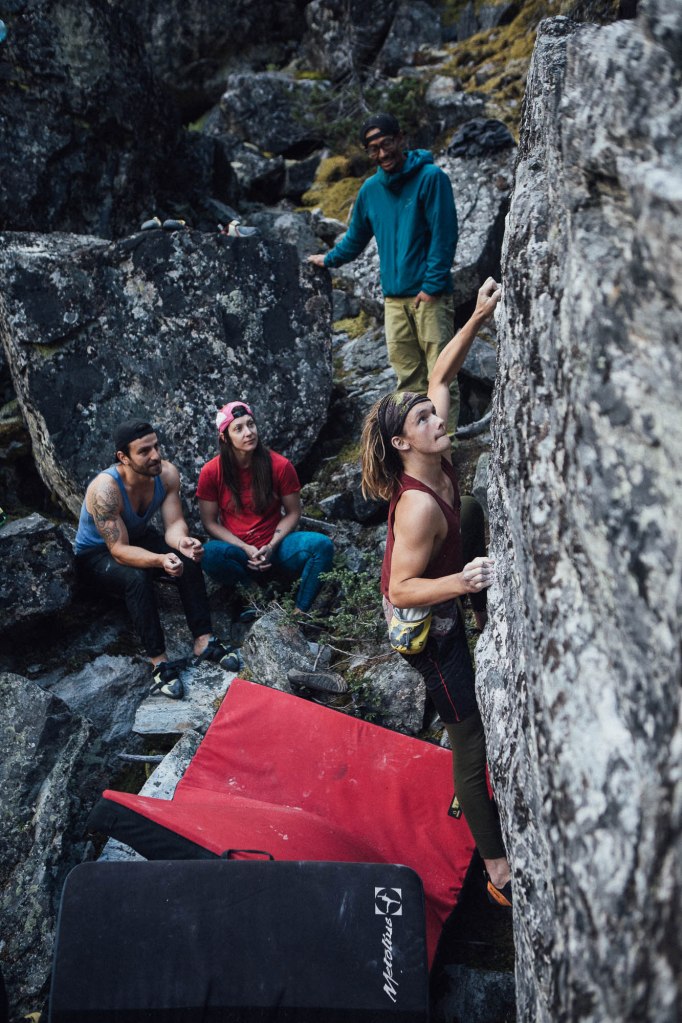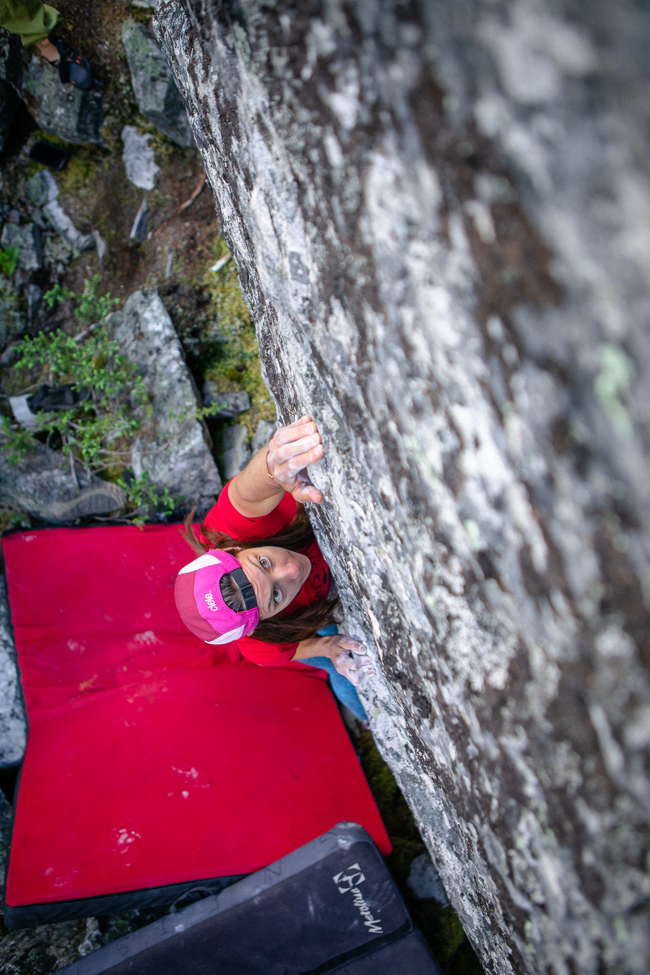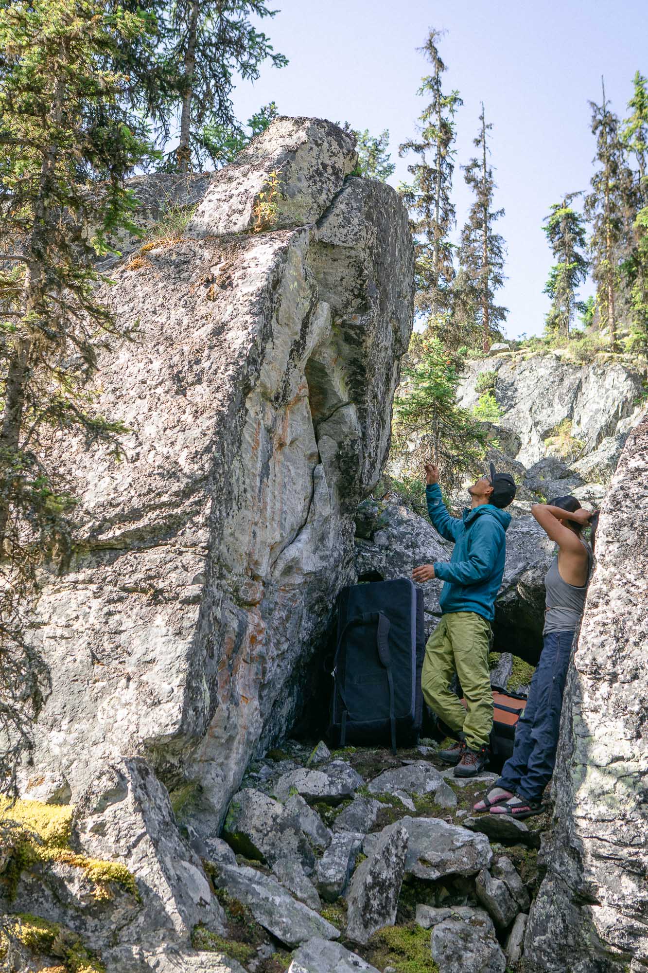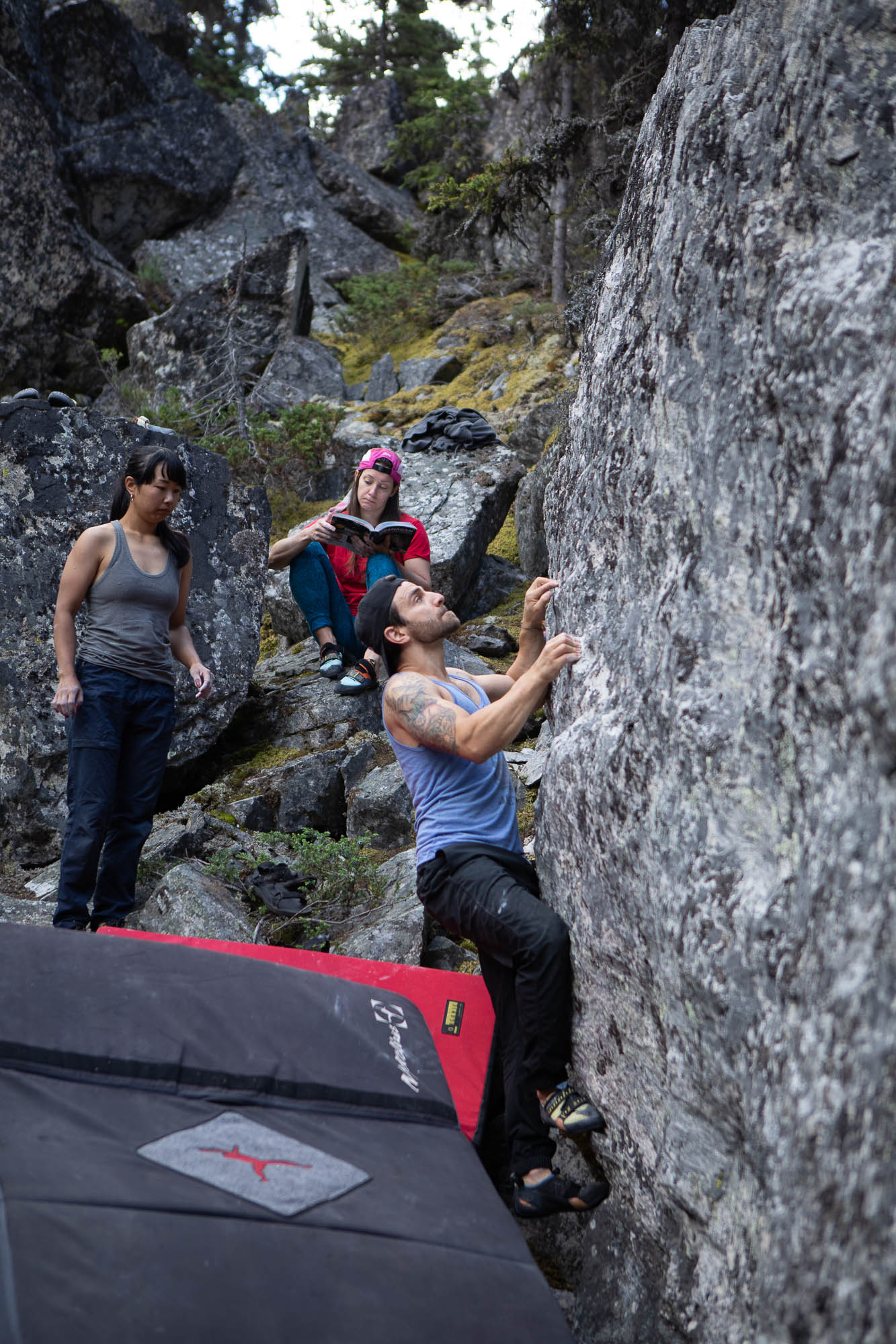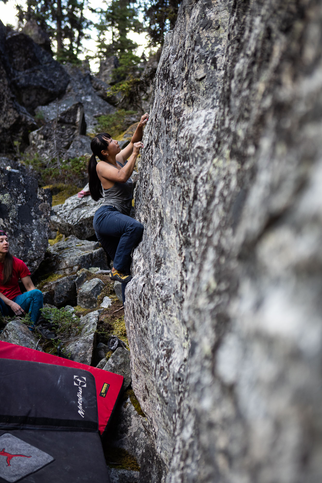 After warm up climbs, we moved to a V6 problem. It starts low on a big boulder, and the line goes up with crimps and sidepulls. We could not climb it, but it was very fun to try.