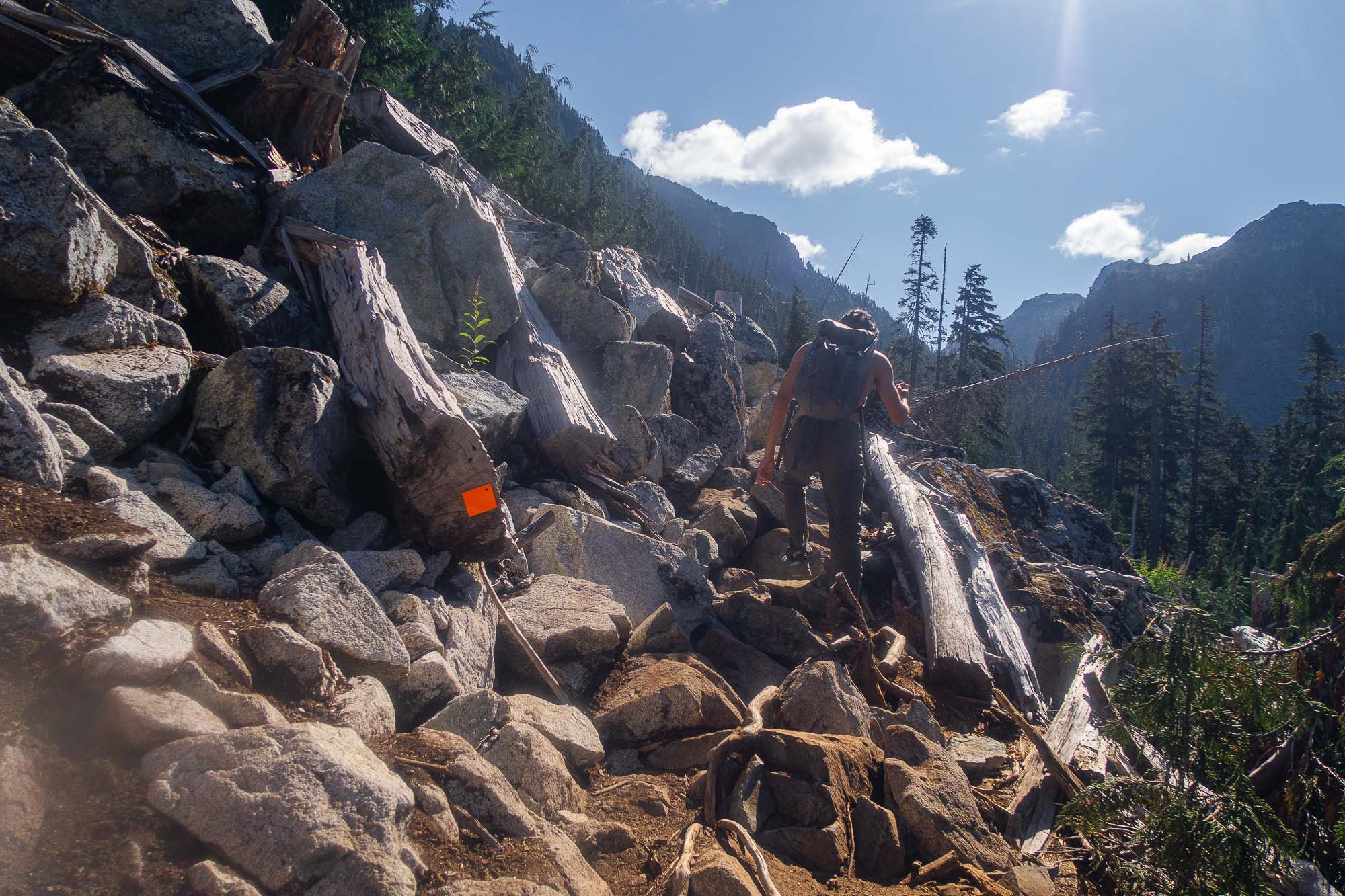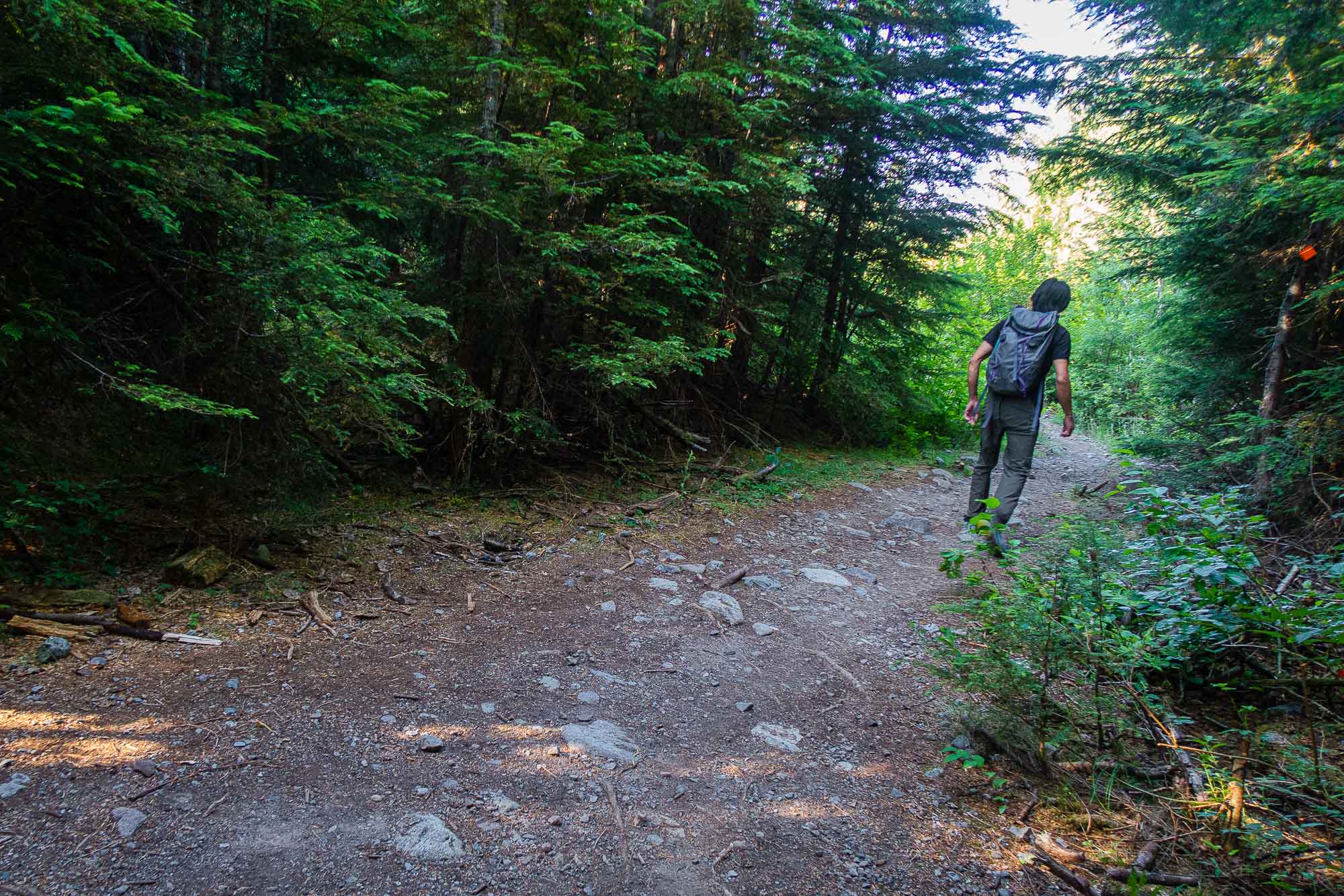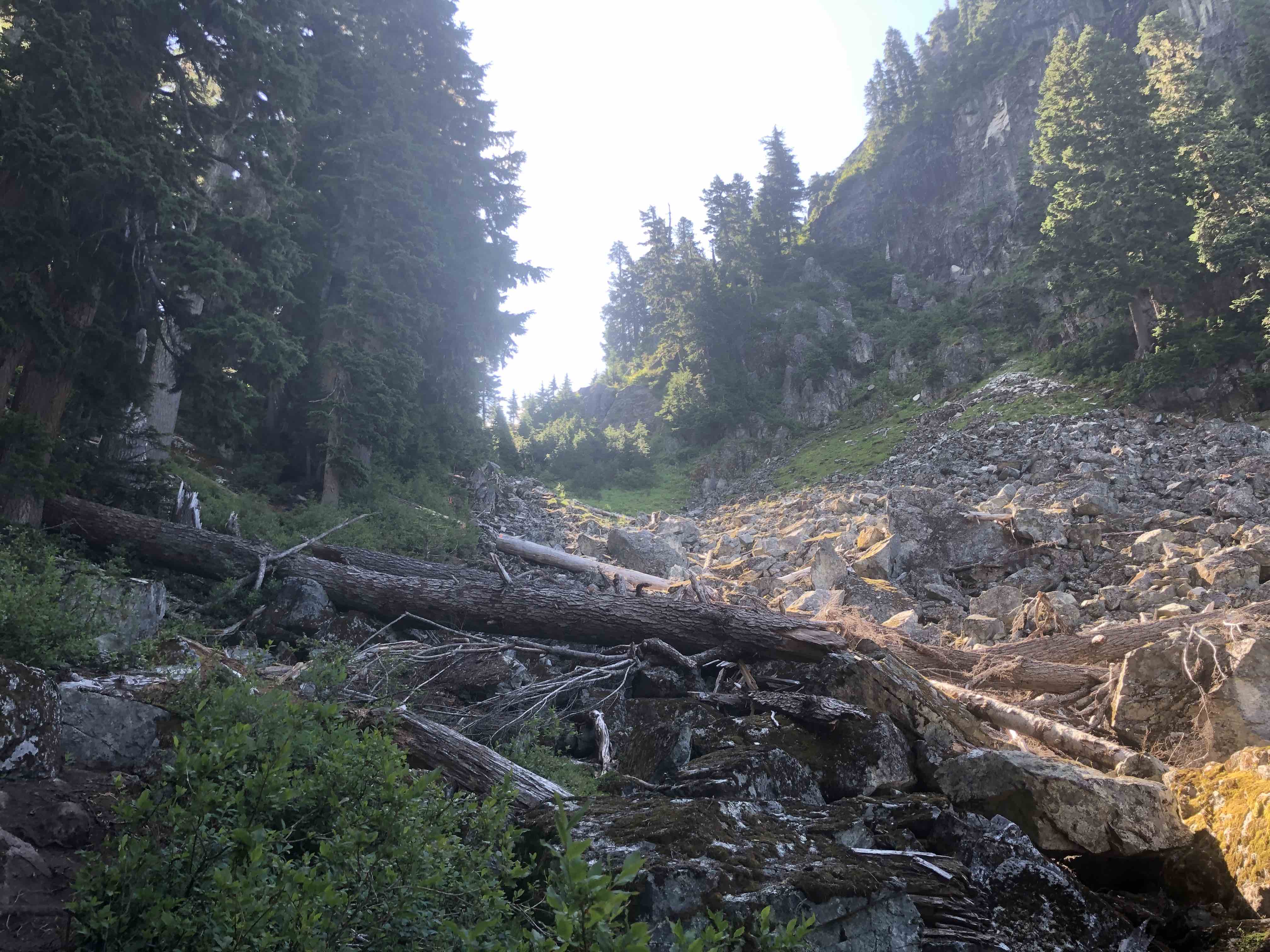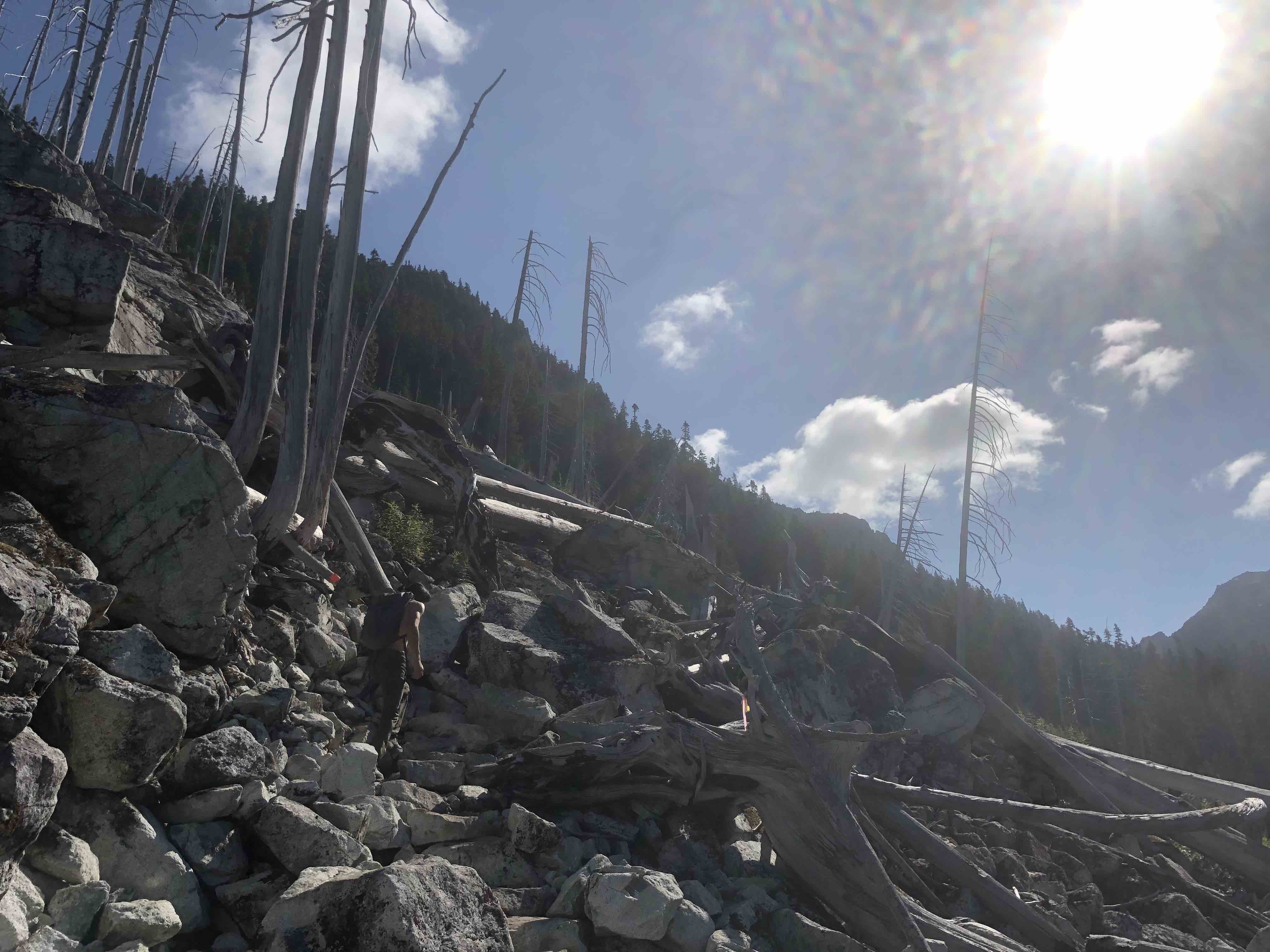 After long travers with some boulder fields, the trail went in a forest. Then, we came to the final uphill. The trail was dusty and slippery, but fairly easy.