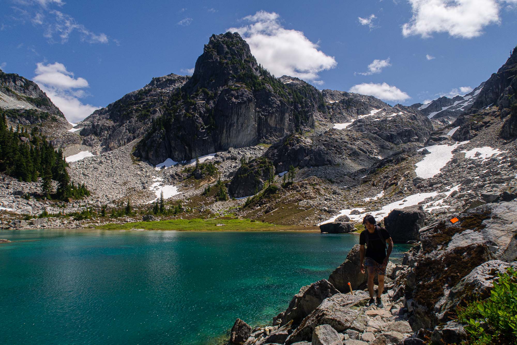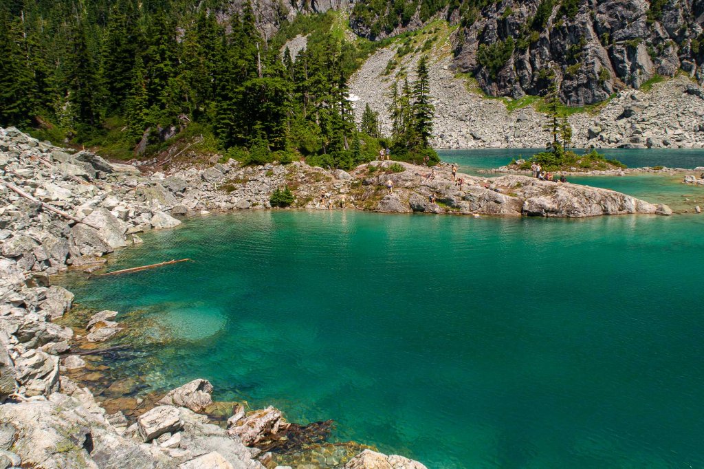 The lake shore was still quiet. We saw more people on the other side, where all the campers were at. We started walking clockwise around the lake. The north side was filled with big boulders and less people, so we stopped on a big flat boulder for lunch.